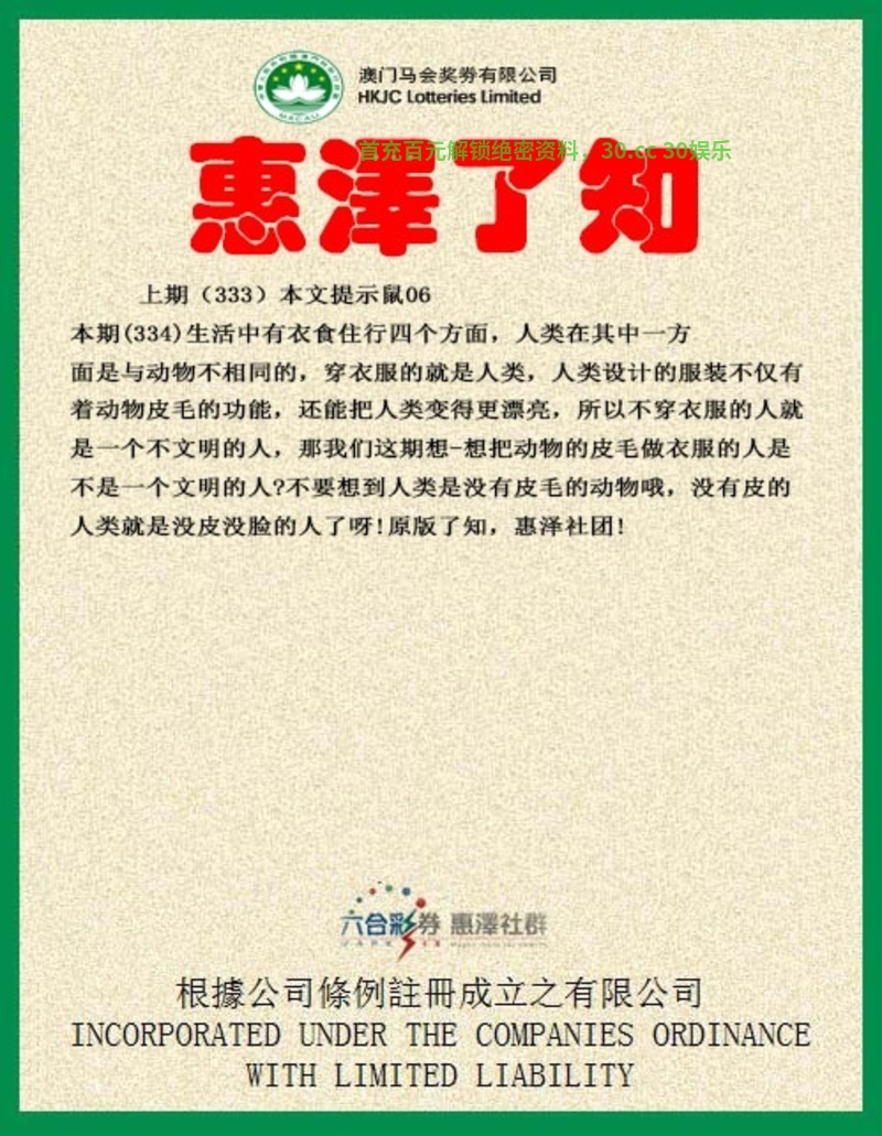 | [惠泽了知] 334期:生活中有衣食住行四个方面,人类在其中一方面是与动物不相同的,穿衣服的就是人类,人类设计的服装不仅有着动物皮毛的功能,还能把人类变得更漂亮,解美肖兔龙蛇马羊鸡。所以不穿衣服的人就是一个不文明的人,那我们这期想-想把动物的皮毛做衣服的人是不是一个文明的人?不要想到人类是没有皮毛的动物哦,没有皮的人类就是没皮没脸的人了呀! [惠泽九肖]:兔龙蛇马羊鸡牛鼠猴 [惠泽平尾]:5555尾 |