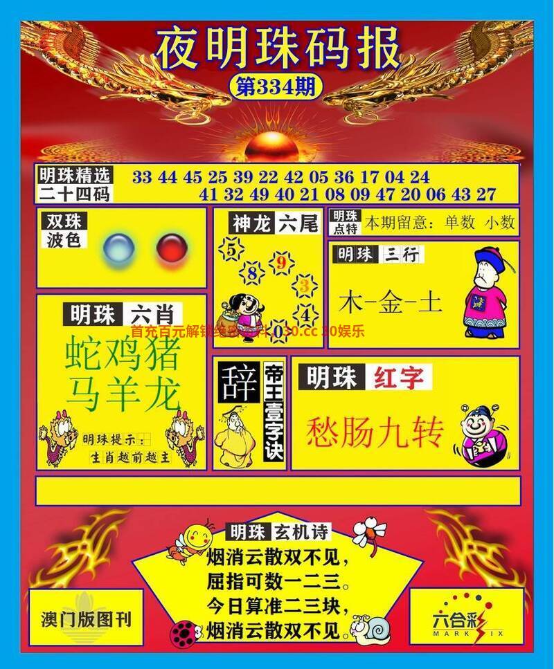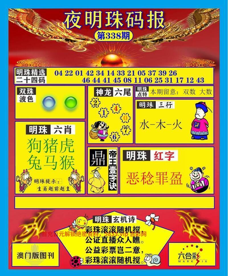 | 338期:玄机诗 彩珠滚滚随机搅,公证直播众人瞧。公益彩票岂二意,彩珠滚滚随机搅。 精选六肖:狗猪虎兔马猴 精选六码:20 31 04 27 12 34 |