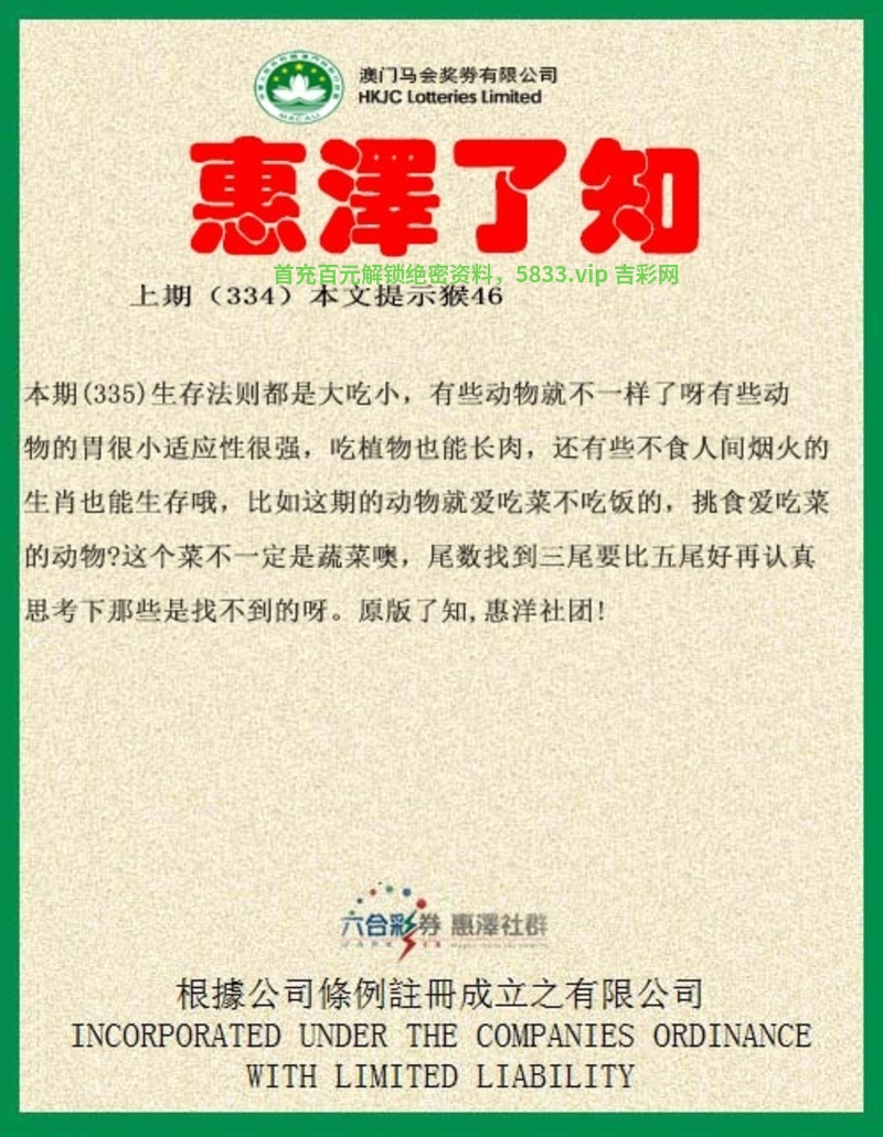 | [惠泽了知] 335期:生存法则都是大吃小,有些动物就不一样了呀有些动物的胃很小适应性很强,吃植物也能长肉,还有些不食人间烟火的生肖也能生存哦,比如这期的动物就爱吃菜不吃饭的,挑食爱吃菜的动物?解吃菜肖猪鼠鸡猴和吃肉肖虎蛇龙狗。这个菜不一定是蔬菜噢,尾数找到三尾要比五尾好再认真思考下那些是找不到的呀。 [惠泽九肖]:猪鼠鸡猴虎蛇龙狗牛 [惠泽平肖]:猪猪猪 |