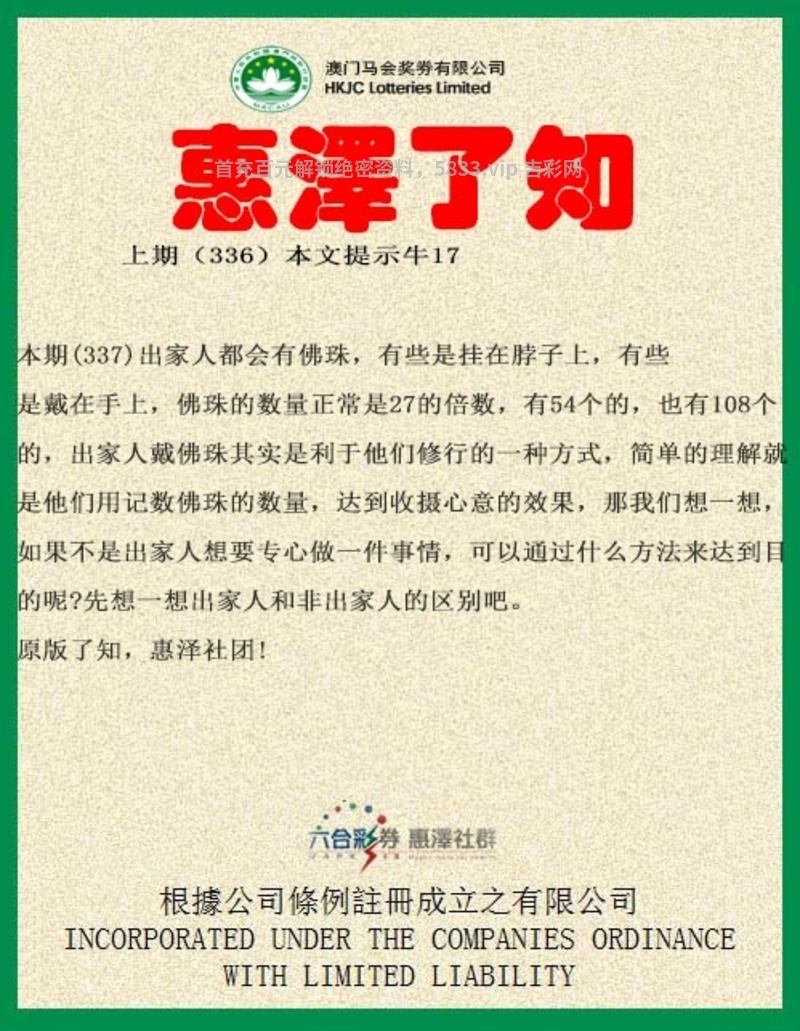 | [惠泽了知] 336期:塞翁失马,焉知非福,指的是塞翁丢失一匹马带回来另一匹马,解明肖马。把祸变成福,那这期我们说说另一位丢马的老汉,老汉解男肖鼠牛虎龙马猴狗。这位老汉丢失了马,去找秀才写篇寻马启示,秀才解肖虎龙猪马。秀才问老汉:“你的马什么时候丢的?”老汉说:“不是去年就是今年”,下句秀才问老汉:“你一共丢了几匹马?”老汉同样回答:“不是一一匹就是两匹”。我们这期就从老汉的回答中找出正确的答案,者老汉找回他的马匹吧。 [惠泽九肖]:马鼠牛虎龙猴狗蛇鸡 [惠泽六肖]:马鼠牛虎龙猴 [惠泽三肖]:马鼠牛 [惠泽特码]:24 48 06 30 05 17 04 16 26 38 |